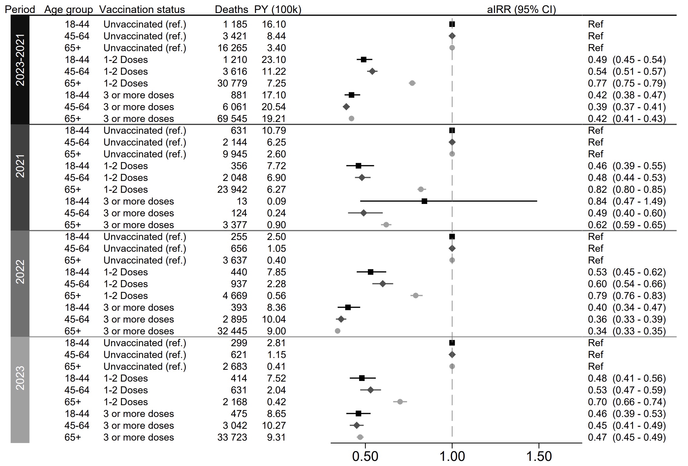 (You might be curious about the one weird apparent exception for fully vaccinated, age 18-44, in 2021 only: the 95% confidence interval crosses 1. If you look at the number of deaths in that vax group and age group for that year, there were only 13! Basically this group was so well protected from dying that there were too few deaths to estimate accurately the 95% confidence interval! That was a very safe time to be a fully vaccinated young Norwegian.)