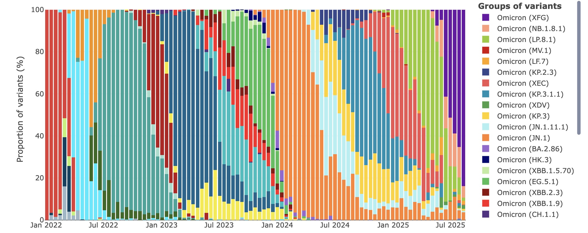 - The fall 2025 vaccine, optimized for LP.8.1, is very likely to be effective against the dominant variant, XFG. XFG is a recombinant (hence name starting with X) sibling of LP.8.1.