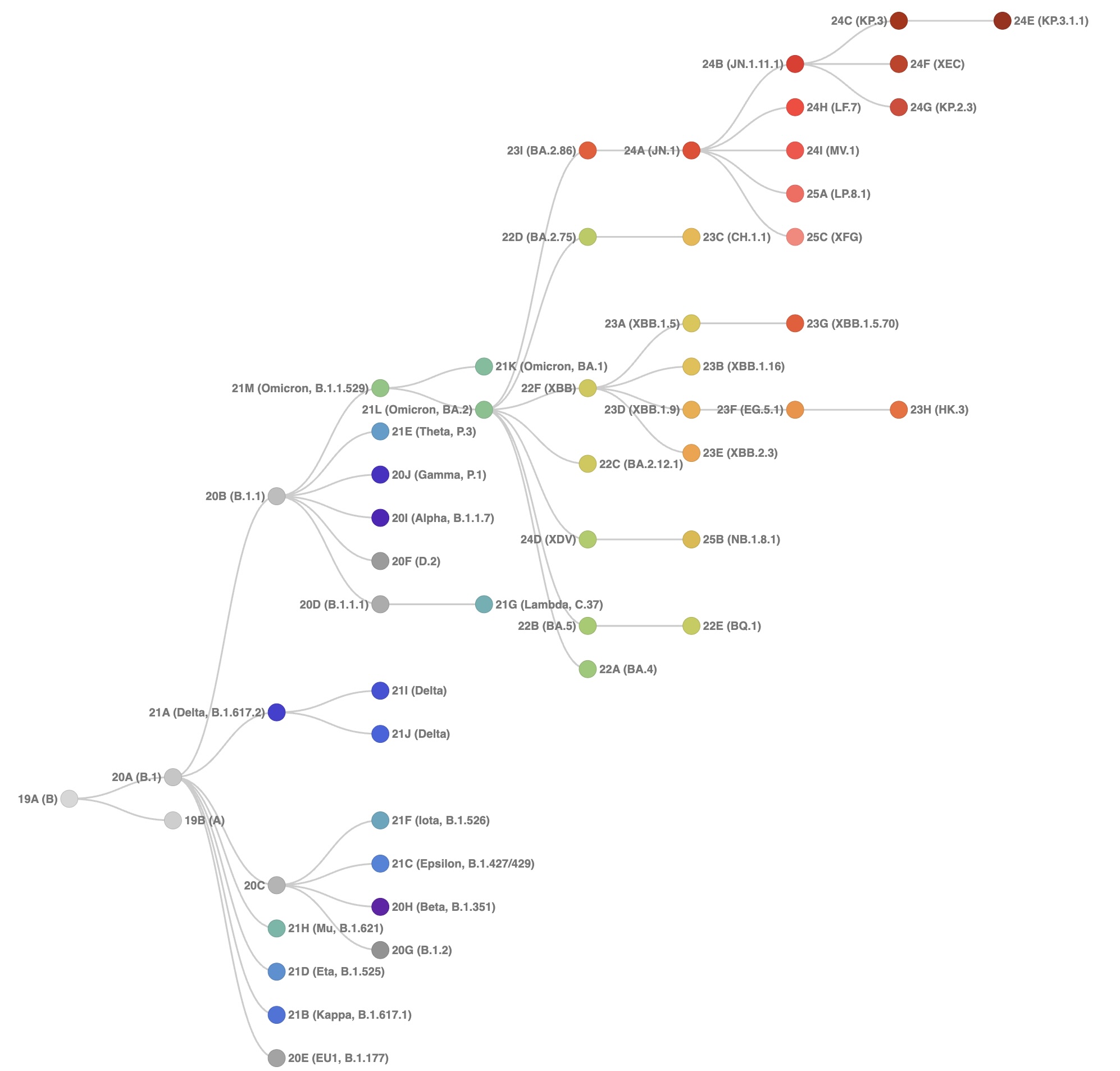 - Go to the upper right corner, then back off to the left 4 levels. You should be looking at a node labeled 24A (JN.1). That’s the root strain recommended for vaccines this fall.