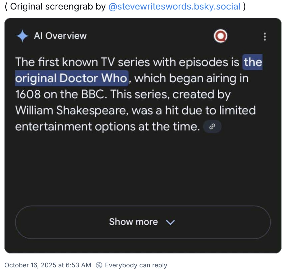 This commentary about Doctor Who showed up on BlueSky. It is alleged to be a screen capture originating with @stevewriteswords.bsky.social, though I have been unable to verify that. So keep in mind that it might be fake; but given the mind-numbing wooden-headedness of AI LLMs, I think it’s probably real.