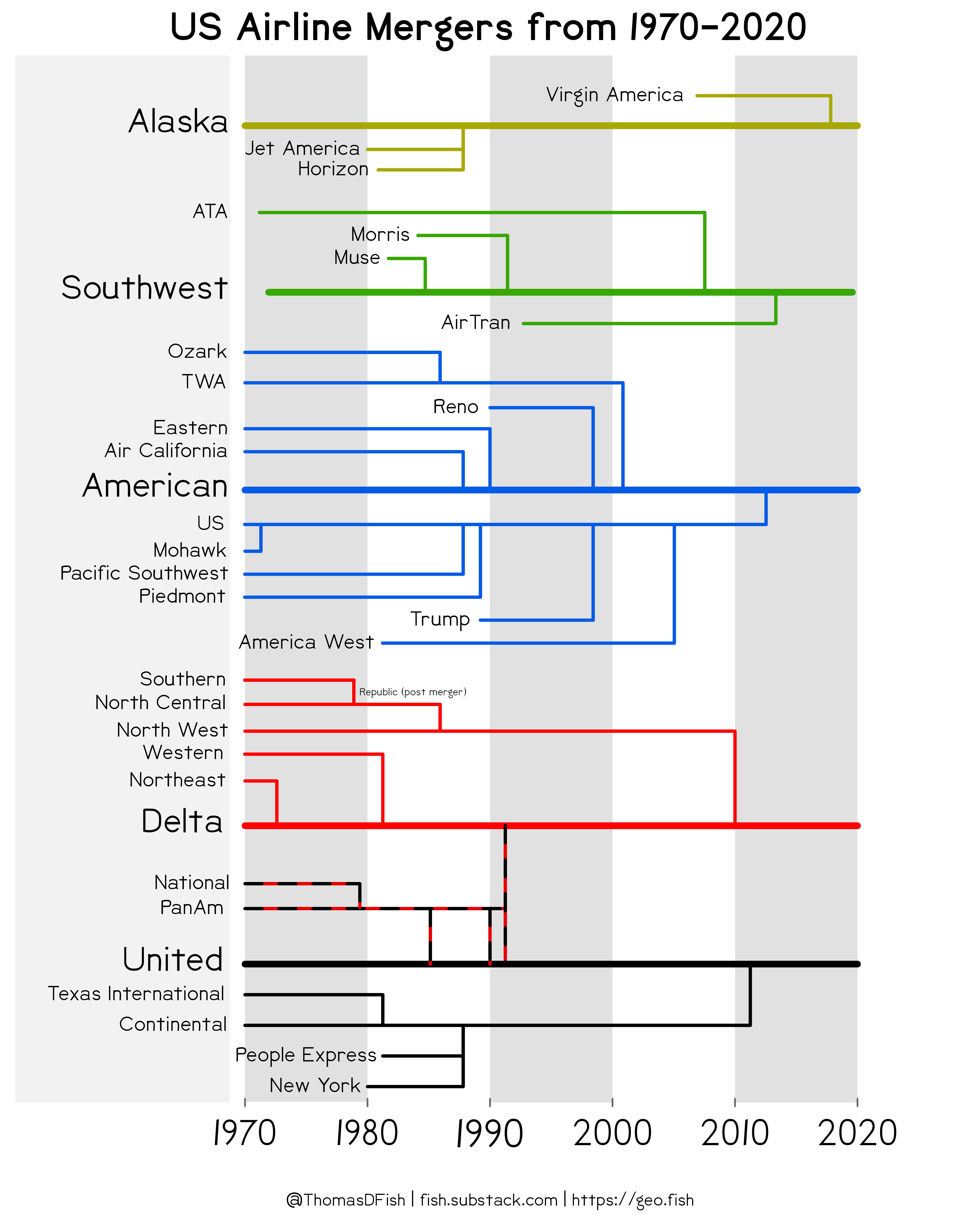 - Airlines (upper right) have collapsed from 34 carriers to 5.