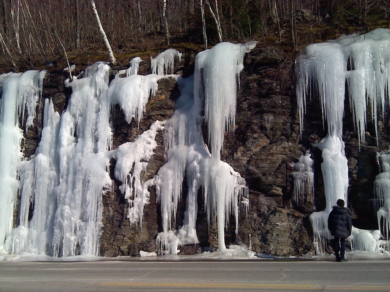There are a number of beautiful things to be seen in winter that you just don’t see in warmer places, or in colder but flat places like the US midwest. Here, for example, is what is sometimes called an icefall: artesian water normally forced out of mountain rocks by pressure, frozen in place in winter. This leads to ginormous icicles hanging from what looks like an ordinary rock face; see the person in the lower right for scale.