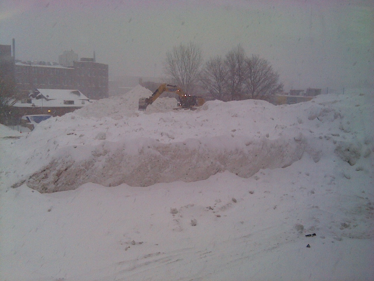 - The first shows just a huge pile of snow and ice, with some yellow earth-moving equipment on top. That thing is big. To give you some idea of scale, this was taken out a 3rd story window, and the big earth moving machine is at about eye level.