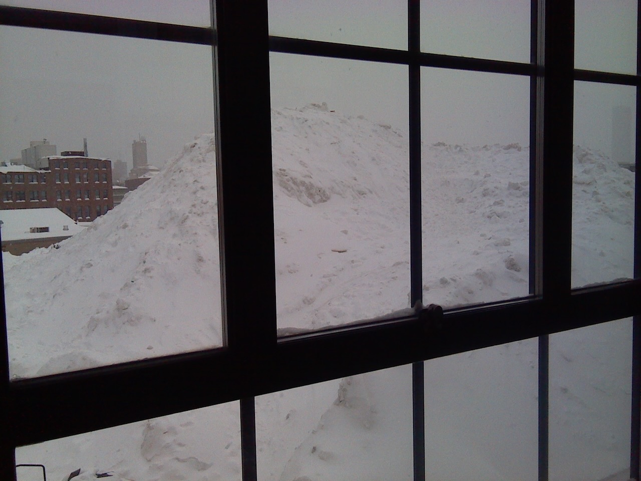 - The third picture shows the snow mountain at what was probably its peak height. Note that we are looking out a 3rd story window, and we are looking up at the peak. That snow farm has built a mountain about 4 stories tall, and as big as a parking lot that spans maybe half a city block. And it was one of dozens such snow farms.
