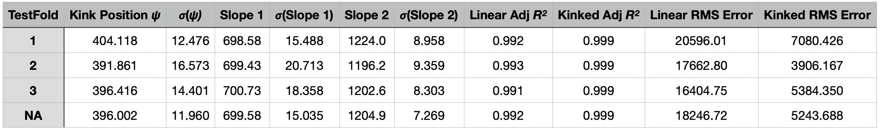- The parameters estimated by the model in each fold are the kink position, slope 1, and slope 2. The thing to take away from the table is that they are pretty stable across all 3 folds of crossvalidation: we’re getting a consistent story on all folds.
