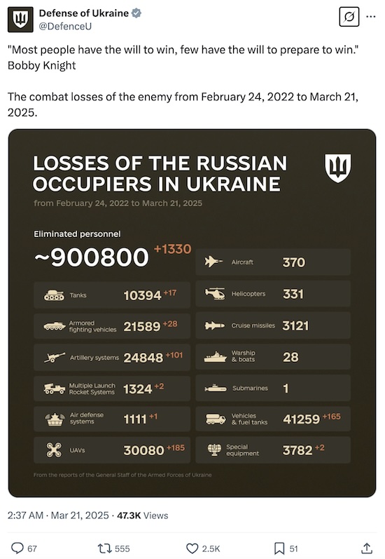 The previous milestone was 800,000 on 2025-Jan-08. That was just about 2.5 months ago, so Russian casualties are currently running at 40,000 dead per month. Every month.