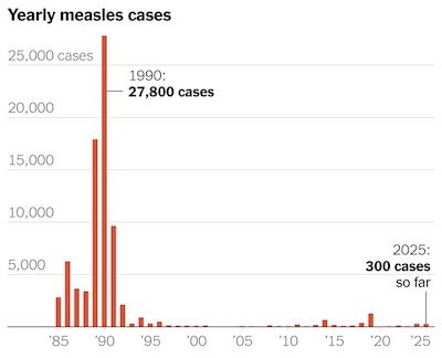 No, apparently not. From a New York Times article, here’s an annual frequency plot of measles cases from 1985 - 2025. [2] Note that the measles vaccine was invented in 1963. [3] It took forty years of public health effort to get vaccination levels up high enough to eliminate it in 2000.