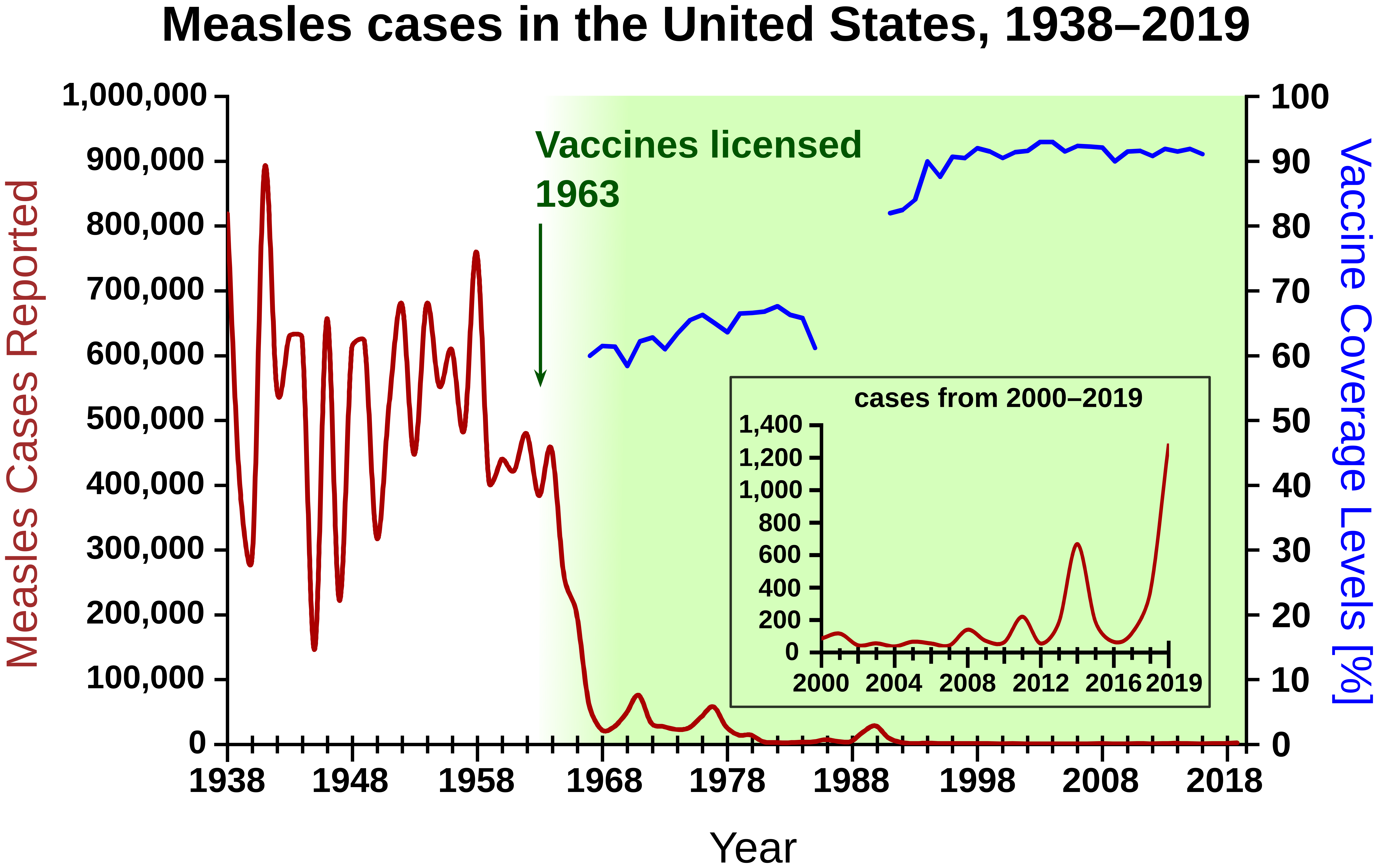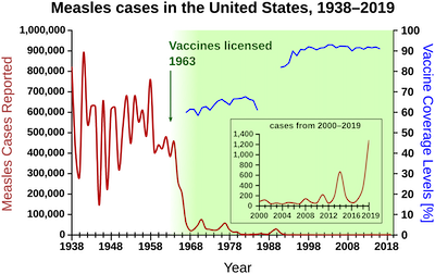 This final graph, from Wikipedia on the MMR vaccine, shows this in dramatic form. Note how rapidly the incidence of measles plummeted post-1963, when the vaccine was introduced. Then in the inset, note how rapidly measles has become a revenant disease, because we’re too stupid for words on the subject of vaccines. Yes, individual freedom is important; but the word “public” in “public health” means we have a responsibility to each other, as well! Right-wing disinformation about vaccines is literally killing people.