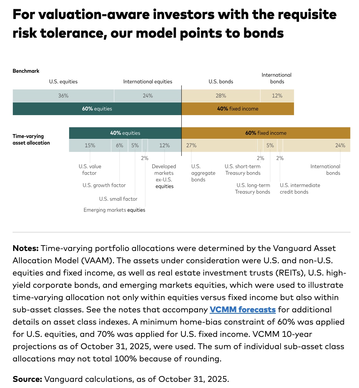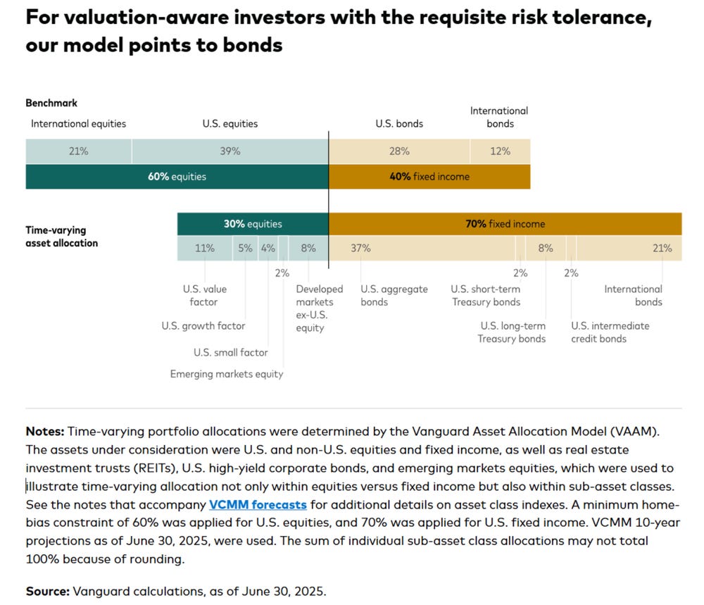 5: Vanguard Staff, “Bonds remain in favor in time-varying model portfolio”, Vanguard web site, 2025-Dec-10. NB: This article is apparently updated periodically, so you should expect to have to look at the latest version. ↩