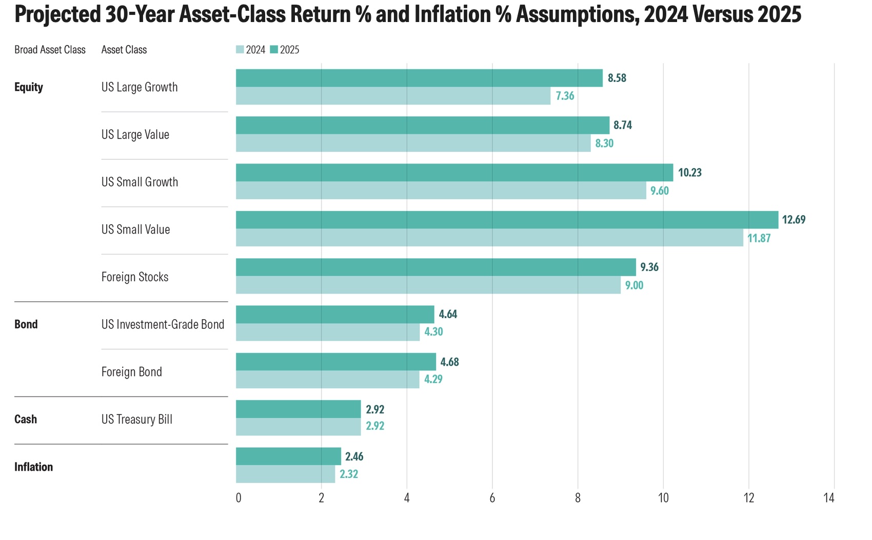 “Our investment strategy group’s projection is that U.S. equity market returns are going to be much more muted in the future,” Davis warns. “Over the past ten years, the S&P returned an average of 12.4% annually. We’re predicting the figure to drop to between 3.8% and 5.8% (midpoint of 4.8%) over the next decade.”