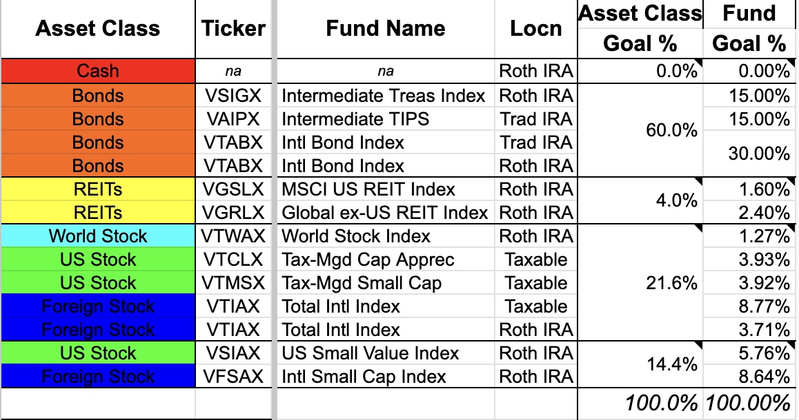 - Tax location: As you can see, the tax-free (Roth IRA) component has increased a bit. That’s because all the stuff likely to grow faster is in the Roth, with only bonds in the Trad IRA. Also, we’re continuing our campaign of doing annual partial Roth conversions, to get as much money put in the tax-free part of the portfolio before RMDs begin. That is, we’re diversifying the tax structure of the portfolio at the same time as the rst of this.