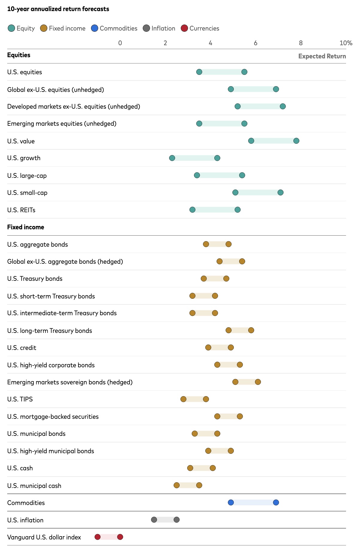 - Method: Vanguard’s forecast is a sophisticated Monte Carlo simulation, done by people whom I think are some of the best available. It’s estimating annualized returns over the next 10 years.