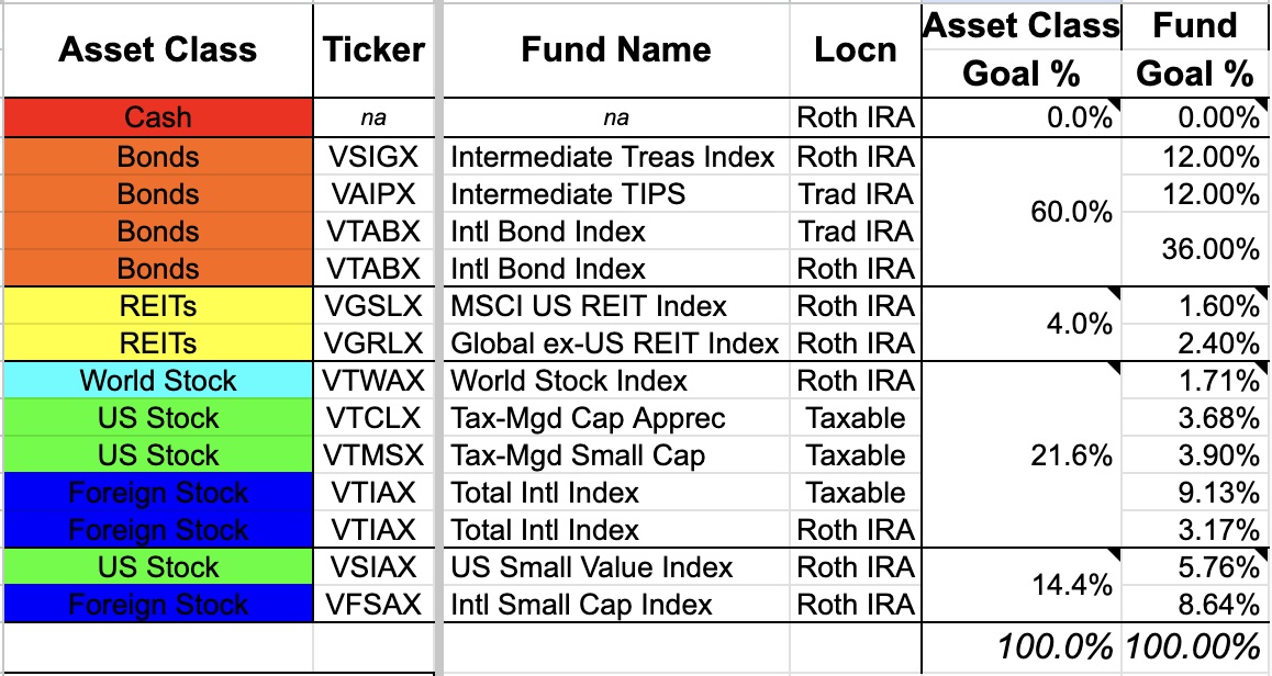 - 60% cap-weighted total market index funds / 40% tilts to small and small-value index funds, within the stock sector.
