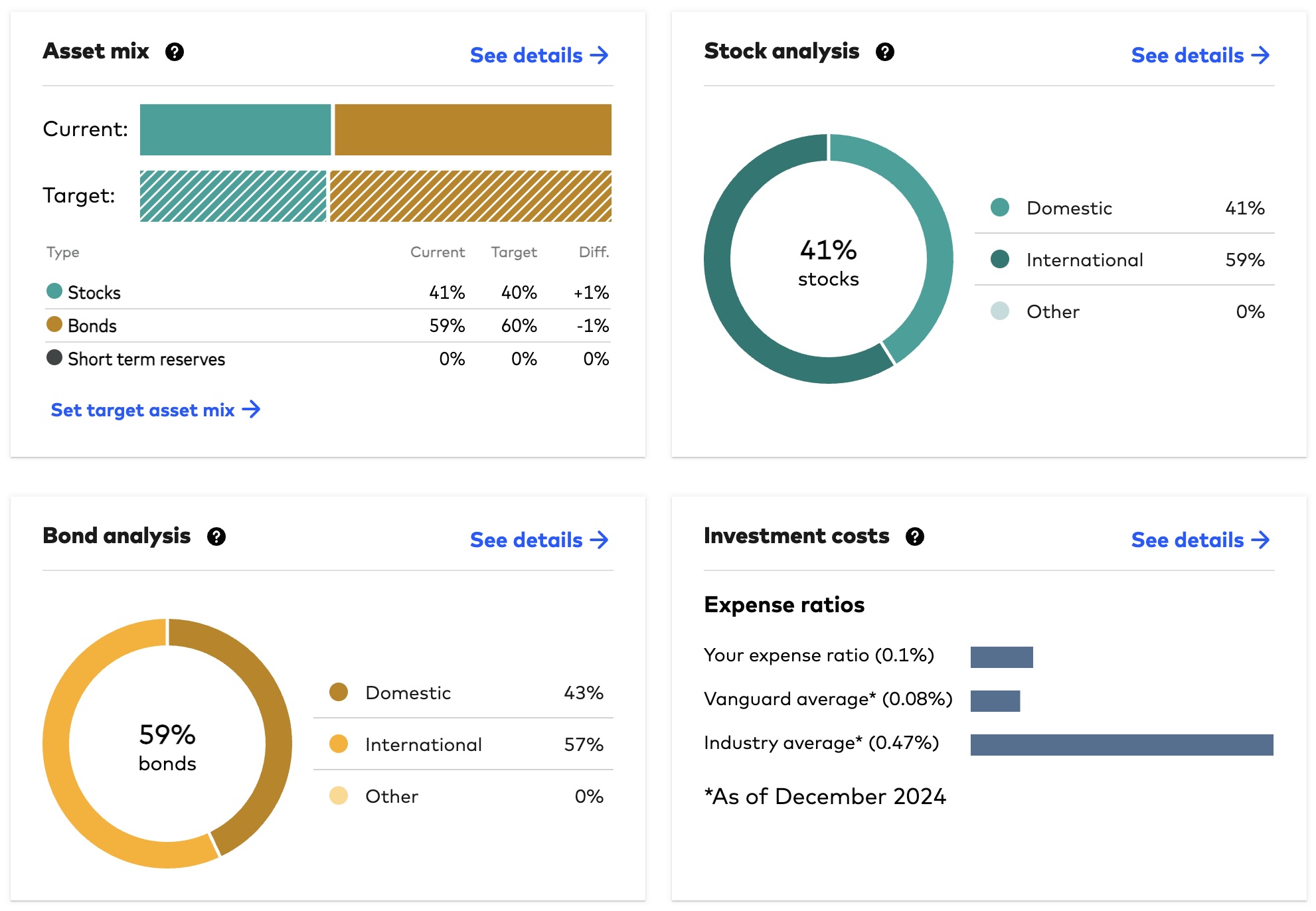 Just to be sure, I got another opinion by using Vanguard’s portfolio tools to get a snapshot of the resulting allocation. I might be wrong about the future, but I don’t want to blunder in how I prepare for it!